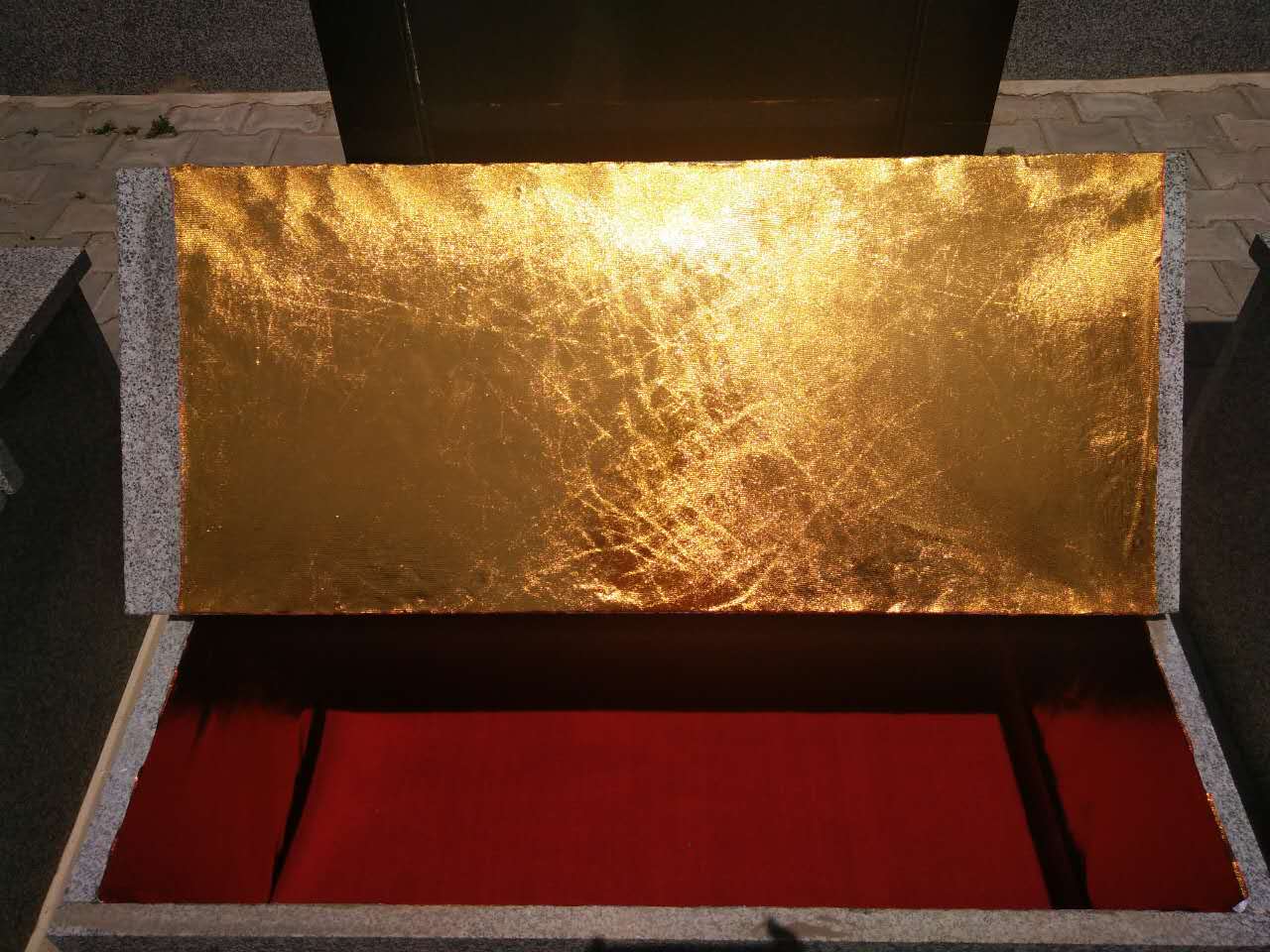 墓室裝修:清掃墓室、二次防水、墓室周圍使用黃綢緞裝裱,地面使用紅地毯進(jìn)行裝裱。