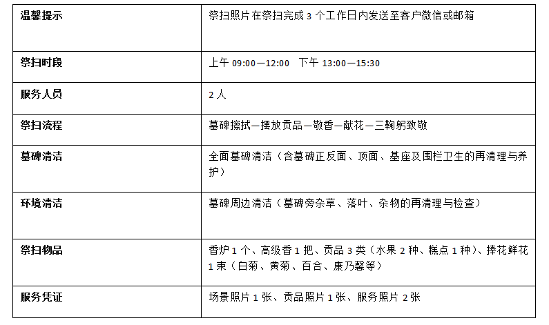 3)是否預(yù)定成功,以收到客戶款項為準(zhǔn),祭掃照片在祭掃完成3個工作日內(nèi)發(fā)送至客戶微信或郵箱。